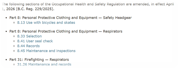 Amendments to the following sections of the Occupational Health and Safety Regulation are in effect November 1, 2024 [B.C. Reg. 132/2023].